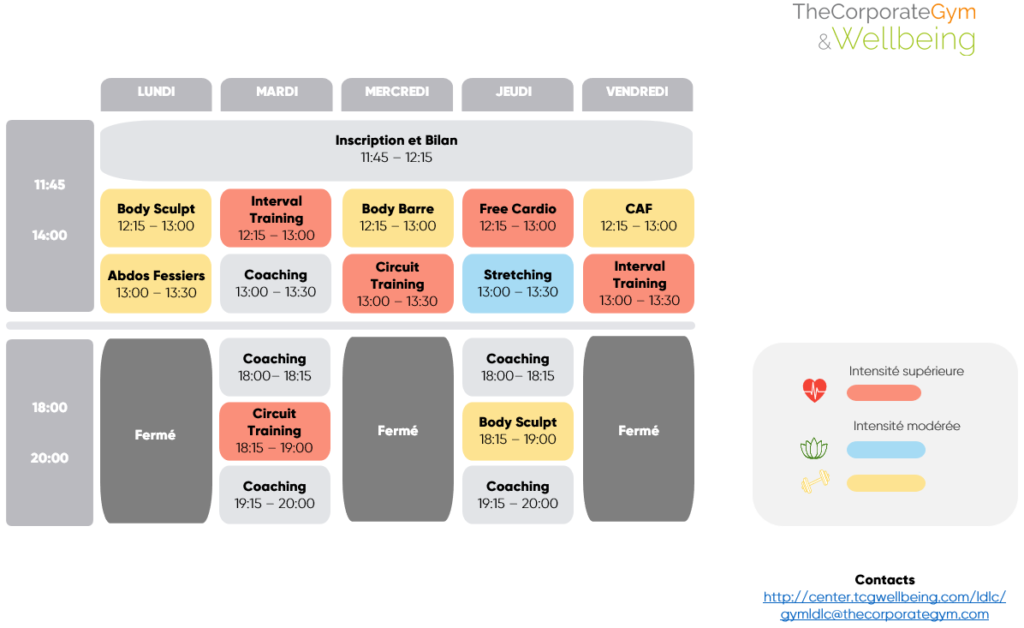 • Gym douce : Cours de faible intensité cardio respiratoire, ayant pour but le renforcement et souplesse, via des postures inspirées du pilates et du yoga.
